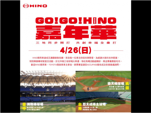 2026年GO!GO!HINO嘉年華4/26於北中南球場同步熱血開打,邀約全台車主同樂應援,共創幸福全壘打