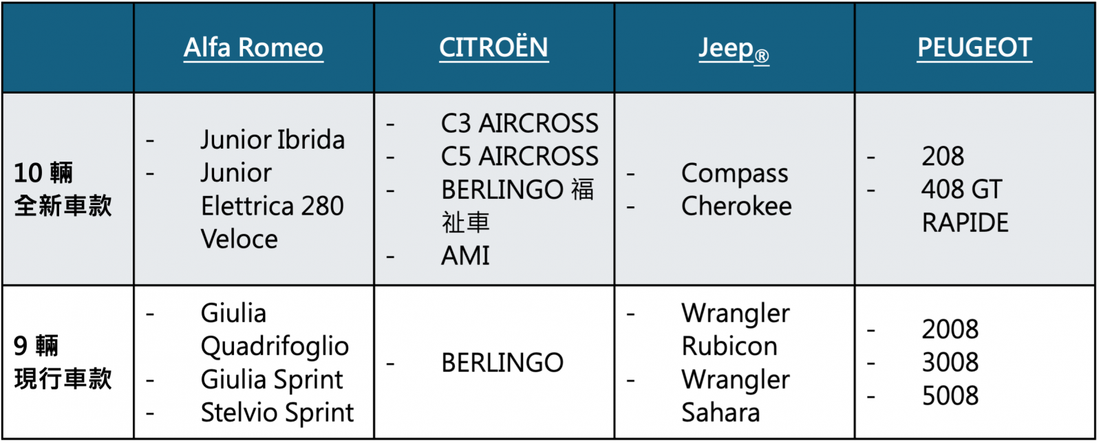 本屆車展所展出的現行車款,涵蓋 PEUGEOT 2008、408、3008、5008,CITROËN BERLINGO,Alfa Romeo Giulia Quadrifoglio、Giulia Sprint、Stelvio Sprint,以及 Jeep® Wrangler Rubicon 與 Wrangler Sahara 等核心產品陣容,橫跨都會、家庭、性能與越野等不同用車情境,清楚呈現寶嘉聯合旗下四大品牌於台灣市場的主力架構與產品完整度。