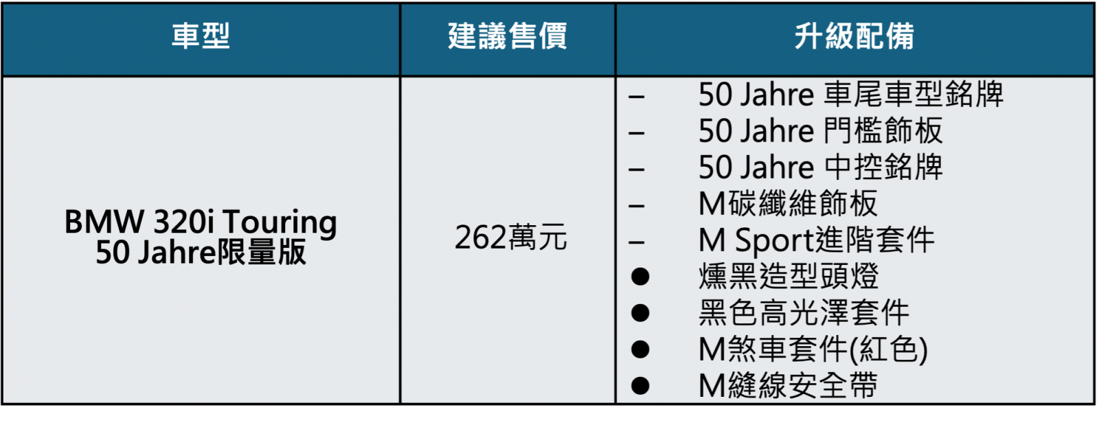 全新BMW 320i Touring 50 Jahre限量版豪華旅行車 建議售價/升級配備