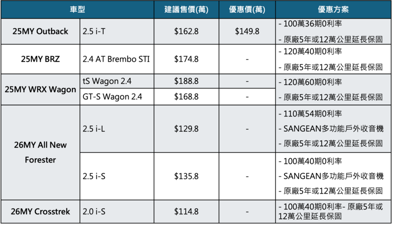 3. 各車款建議售價及優惠價格資訊詳情依展示中心與經銷商現場公告為準,台灣速霸陸保留最終更動之權利。