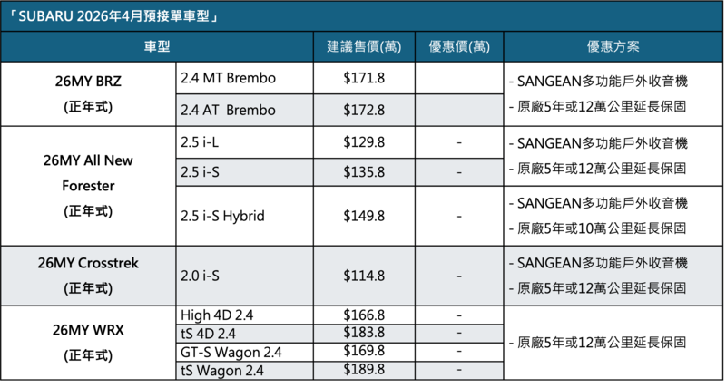 「SUBARU 2026年4月預接單車型」