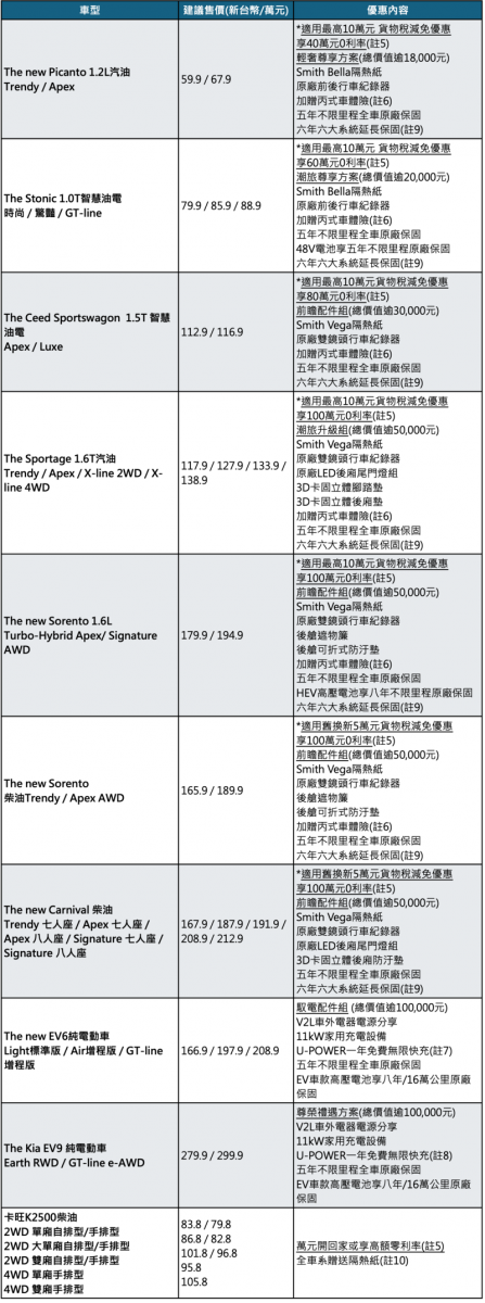 為一同迎接嶄新的2026年,Kia台灣總代理森那美起亞推出本月「萬眾榮耀」限時禮遇,即刻入主The Picanto、The Stonic、The Ceed Sportswagon、The Sportage、The Sorento、The Carnival等指定車型,可享高額0利率、丙式車體險與專屬配件組等3重禮遇。此外,多款車型同步適用最高10萬元貨物稅減徵新政策,並享有Kia乘用車五年不限里程全車原廠保固以及今年正式啟動之「六年六大系統延長保固」專案,入主Kia輕鬆無負擔。Kia總代理台灣森那美起亞誠摯邀請所有消費者蒞臨Kia展示中心,體驗Kia的品牌精神「Movement that Inspires移動.啟發人心」,開啟美好的移動新生活!