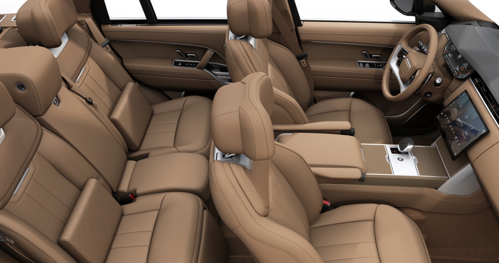 車內延續外觀設計風格,包括全車座椅、車頂篷、安全帶與腳踏墊皆使用經典的 Caraway 香芹籽棕色作為主調,營造與車身相同的低調奢華氛圍;延續 SV Intrepid 主題設計,採用黑色陶瓷所製成的排檔座、控制旋鈕與啟動按鍵,點綴奢華質感細節。前座椅面採用 Near-Aniline leather 近苯胺頂級皮革,後座則採用 Semi-Aniline leather 半苯胺皮革,於座椅肩靠與後座腰部靠枕採用 SV Bespoke 特殊訂製鑽石樣式刺繡,呈現奢華且不失舒適的乘坐感受,客製化車門金屬門檻鑲嵌 Range Rover SV Fifty-Five 字樣,低調宣示其不凡意義。