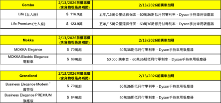「Mokka、Grandland」優惠: 即日起至2/13/2026止,凡入主Grandland & Mokka,皆可享有60萬36期低月付零利率並加贈價值9,900的Dyson手持車用吸塵器。