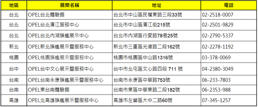 OPEL 全台展示暨服務中心: