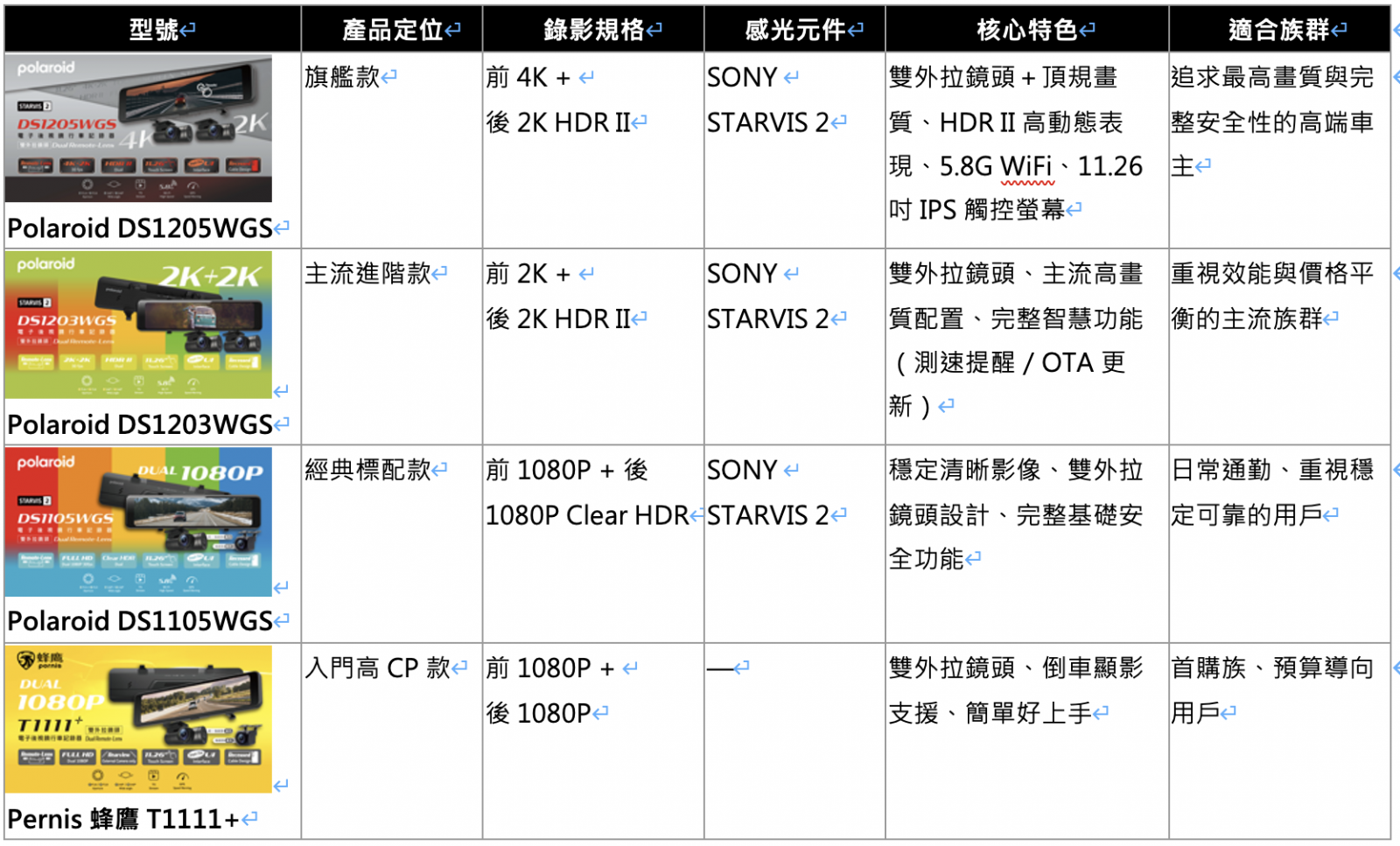主流進階機型 Polaroid DS1203WGS 則以前後2K HDR II配置切入市場,在性能與價格之間取得最佳平衡,成為多數駕駛的實用首選;而經典標配款 Polaroid DS1105WGS 與入門高CP款 Pernis蜂鷹 T1111+ 則延續品牌影像調校優勢,在1080P規格下依然維持穩定清晰表現,滿足入門與日常需求。整體產品策略不再只是規格堆疊,而是回歸「在關鍵時刻看得清楚」這項最核心的價值。