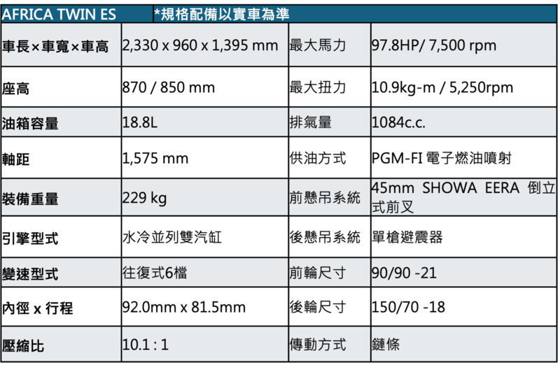 Honda Taiwan 秉持 「The Power of Dreams – How we move you.」 的品牌精神,致力於提供卓越的產品與服務,Africa Twin憑藉獨特且充滿運動感的外型、充沛飽滿的動力表現,以及兼具性能與舒適性的車款設定,成功奠定現代全方位冒險家的定位,不論是壯闊冒險、或是週末長途旅行皆深受青睞,2026年式AFRICA TWIN ES新增電子懸吊以及配備無内胎鋼絲框,進一步提升騎乘舒適性。