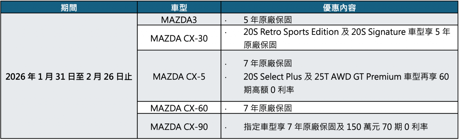 MAZDA 2 月購車優惠專案內容由台灣馬自達與 MAZDA 授權經銷商共同提供,專案僅適用於 2026 年 1 月 31 日起訂購,並於 2026 年 2 月 26 日前領牌之特定 MAZDA3/ CX-30/ CX-5/ CX-60/ CX-90 車型。特定車型享有的「5 年原廠保固」係指⾃領牌⽇起算 3 年或⾥程數達 10 萬公⾥ (以先屆滿者為準) 之新⾞保固期限屆滿後,可再享有 2 年不限⾥程之 MAZDA 延⻑保固;特定車型享有的「7 年原廠保固」,係指⾃領牌⽇起算 3 年或⾥程數達 10 萬公⾥ (以先屆滿者為準) 之新⾞保固期限屆滿後,可再享有 4 年不限⾥程之 MAZDA 延⻑保固,並分為兩階段,第一階段為 4-5 年「全域安心型」延長保固,第二階段為 6-7 年「核心守護型」延長保固。有關 MAZDA 延長保固之注意事項,請參閱台灣馬自達官方網站之「MAZDA 延長保固方案」說明及「MAZDA 延長保固方案權益手冊」。貸款額度依車型售價與實際核貸金額為主,台灣馬自達與 MAZDA 授權經銷商保留專案內容變更及最終解釋之權利,租賃車、大宗批售、優惠批售及計程車等,不適用本專案,更多活動詳情請見台灣馬自達官方網站。