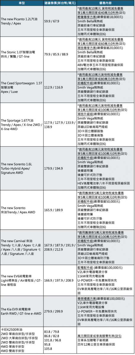 為感謝所有喜愛Kia好朋友們的肯定,Kia總代理台灣森那美起亞特別推出「煥然一新.萬元入主」限時禮遇方案(註3):本月入主The Picanto、The Stonic、The Ceed Sportswagon、The Sportage、The Sorento Turbo-Hybrid,不僅適用最高10萬元貨物稅減徵新政策,更即享1萬元起開回家或高額0利率,並加贈丙式車體險、以及總價值最高超過5萬元以上的專屬配件組。