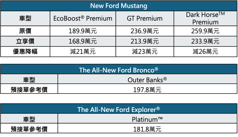 另一方面,Ford揭露首波導入熱銷全球市場的The All-New Ford Bronco® Outer Banks®與The All-New Ford Explorer® PlatinumTM,顯示其未來美製車導入台灣市場的戰略布局野心,並同步啟動預接作業。本次同步公布預接單參考價,其中The All-New Ford Bronco® Outer Banks®為197.8萬元、The All-New Ford Explorer® Platinum™為181.8萬元;前述價格係以零關稅條件提前進行試算,作為未來導入的重要參考基準〔註二〕;為回應市場的熱烈期盼,現階段消費者僅需支付部分定金5,000元(定金總額為10萬元),即可搶先預約車輛排序〔註三〕。如想了解更多訊息,歡迎至Ford 官方網站資訊頁留下聯繫資訊,Ford銷售顧問將與您聯繫、為您服務。福特六和誠摯邀請渴望突破框架的品味玩家,把握契機,以從容之姿,率先入主美式經典駕馭。