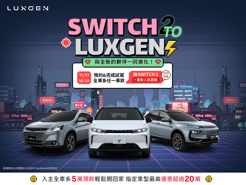 即日起至11/30止,預約並完成試駕任一LUXGEN車款,即有機會抽中最新一代 Nintendo Switch 2 主機與「最新人氣遊戲」,邀你與全新的夥伴一同進化,體驗從駕馭到娛樂的雙重精彩。此外,LUXGEN全車系適用「頭款5萬元」輕鬆入主專案,包含n⁷全車系(n⁷ 5人Aero 電掣特仕版除外)、URX NEO、U6 NEO,加上各項當月限定優惠、好禮,指定車型最高優惠超過20萬!本月入主n⁷ 5人Aero 電掣特仕版享「100萬高額低利率分期」方案(3),n⁷全車系再搭配四年最高20%充電點數回饋,讓你輕鬆買車、放心用車!不論是油轉電、還是升級純電生活,都能輕鬆入主、立即展開風馳電掣的旅程。11月LuxShop線上商城加碼推出「亮點狂灑購物祭 LuxShop 雙11」限時活動,11月10日至11月30日活動期間享四大優惠:購買指定商品享最高111點亮點回饋、首次下單加碼再送11點亮點、消費滿1,500元即享免運、消費滿999元即獲得抽獎機會(4)!買越多賺越多快把握機會趕緊來LuxShop逛逛品牌精選好物。欲知更多活動及車款優惠詳情,歡迎至LUXGEN官網預約來店賞車,或電洽客服專線0800-588-088,立即預約試乘Switch to LUXGEN,切換屬於你的移動新篇章!