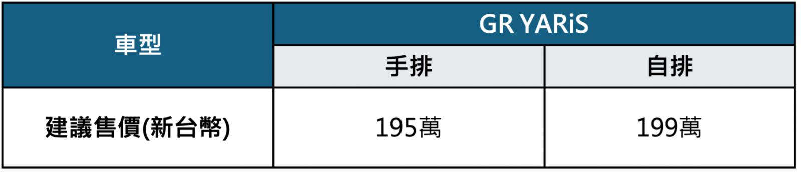 歡慶GR YARiS連年蟬聯世界拉力錦標賽(WRC)冠軍,TOYOTA為了感謝台灣車迷支持,正式導入GR YARiS自排車型,並推出極具吸引力的價格新台幣199萬元,邀請所有熱血車迷一同感受 GAZOO Racing 的性能魅力。