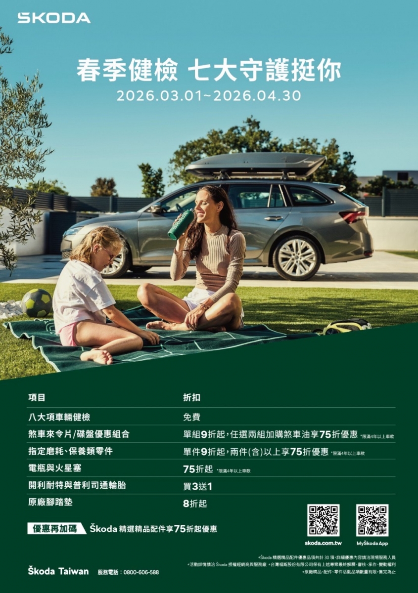 隨著春季來臨、氣溫回暖,車輛在歷經冬季使用後,底盤、煞車與各項耗材也進入關鍵檢視時點。Škoda Taiwan 宣布,自 2026 年 3 月 1 日至 4 月 30 日推出「Škoda 春季健檢-七大守護挺你」服務活動,透過原廠標準化檢測流程與多項保養優惠,協助車主於旅遊旺季前完成整備,確保行車安全與車輛性能維持在最佳狀態。