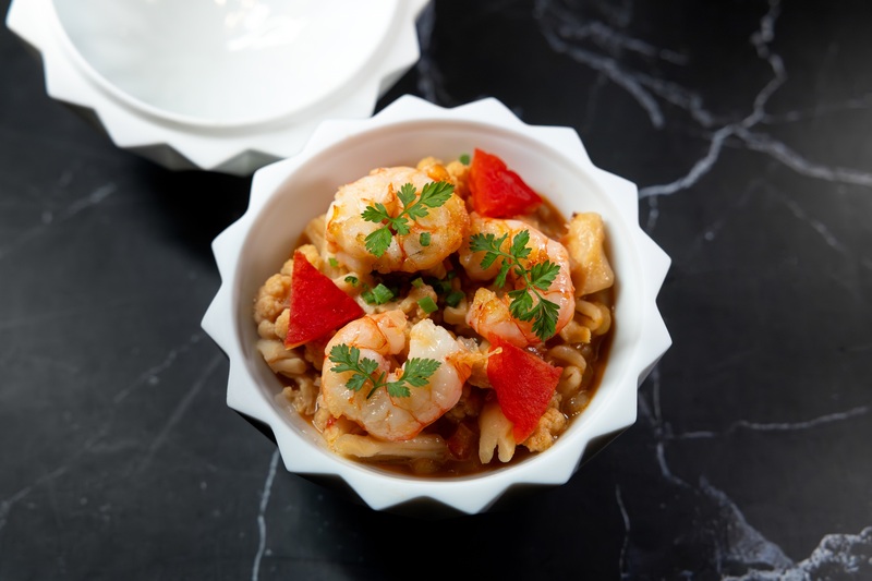 晚宴從清新開場的小點開始,以櫻花蝦、水蓮與鳳梨等元素帶出春天明亮的酸甜氣息;接續以東港黑鮪魚與澎湖海菜呈現海港鮮味,再透過澎湖軟絲與日曬乾物交織出海風與陽光的氣息。隨著餐序推進,料理逐漸轉入更為深厚的風味層次,主餐則提供炭烤菲力牛排與乾式熟成玉露鴨兩種選擇,分別展現飽滿肉香與細緻果香風味。整體套餐亦特別規劃搭餐飲品,透過精選酒款與無酒精飲品的安排,使杯中風味與料理相互呼應,讓整體用餐體驗更加完整,甜點部分首先以當季枇杷與茉莉花茶凍構成清新的前甜點,透過果香與茶韻為味蕾帶來輕盈轉折;最後以多數人對高雄的記憶「木瓜牛奶」為靈感發展主甜點,透過木瓜sorbet 的清爽果香與細緻奶香風味,搭配小米牛奶甜粥帶來溫潤口感,並以橙花香氣點綴,讓整體甜點在清爽與柔和甜香之間取得平衡,為這場春季餐桌畫下優雅句點。