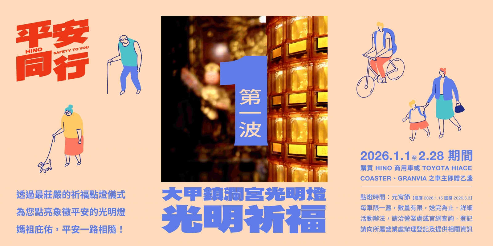 首波行動,和泰商用車以實際回饋感謝車主長期支持。本次「大甲鎮瀾宮光明燈祈福」活動自 2026 年 1 月 1 日起至 2 月 28 日止。凡於活動期間購買HINO 商用車及 TOYOTA COASTER、GRANVIA、HIACE 之車主,即贈送「大甲鎮瀾宮光明燈」乙盞註2。符合資格之車主,須向所屬營業處辦理登記。光明燈將於元宵節(農曆正月十五,2026 年 3 月 3 日) 正式上燈。上燈後,鎮瀾宮誦經團將於農曆每月初一及十五,為燈主恭誦經文、祈福祝禱,象徵全年平安,守護車主每一趟行程安心出發、順利返程。
