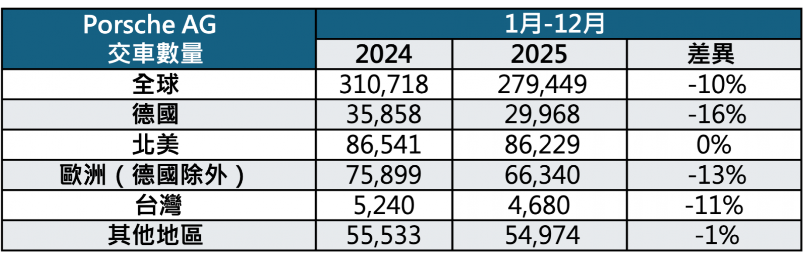 Taycan 交付量為 16,339 部(下滑 22%),主要受電動車轉型速度放緩影響。Cayenne 車系在 2025 年共交付 80,886 部,下滑 21%,部分原因歸於前一年消化延遲訂單的基期效應。全新純電 Cayenne 已於 去年11 月全球首發,首波市場預計將於今年春季開始交付給客戶。該車型將與燃油引擎及插電式混合動力版 Cayenne 同步銷售。
