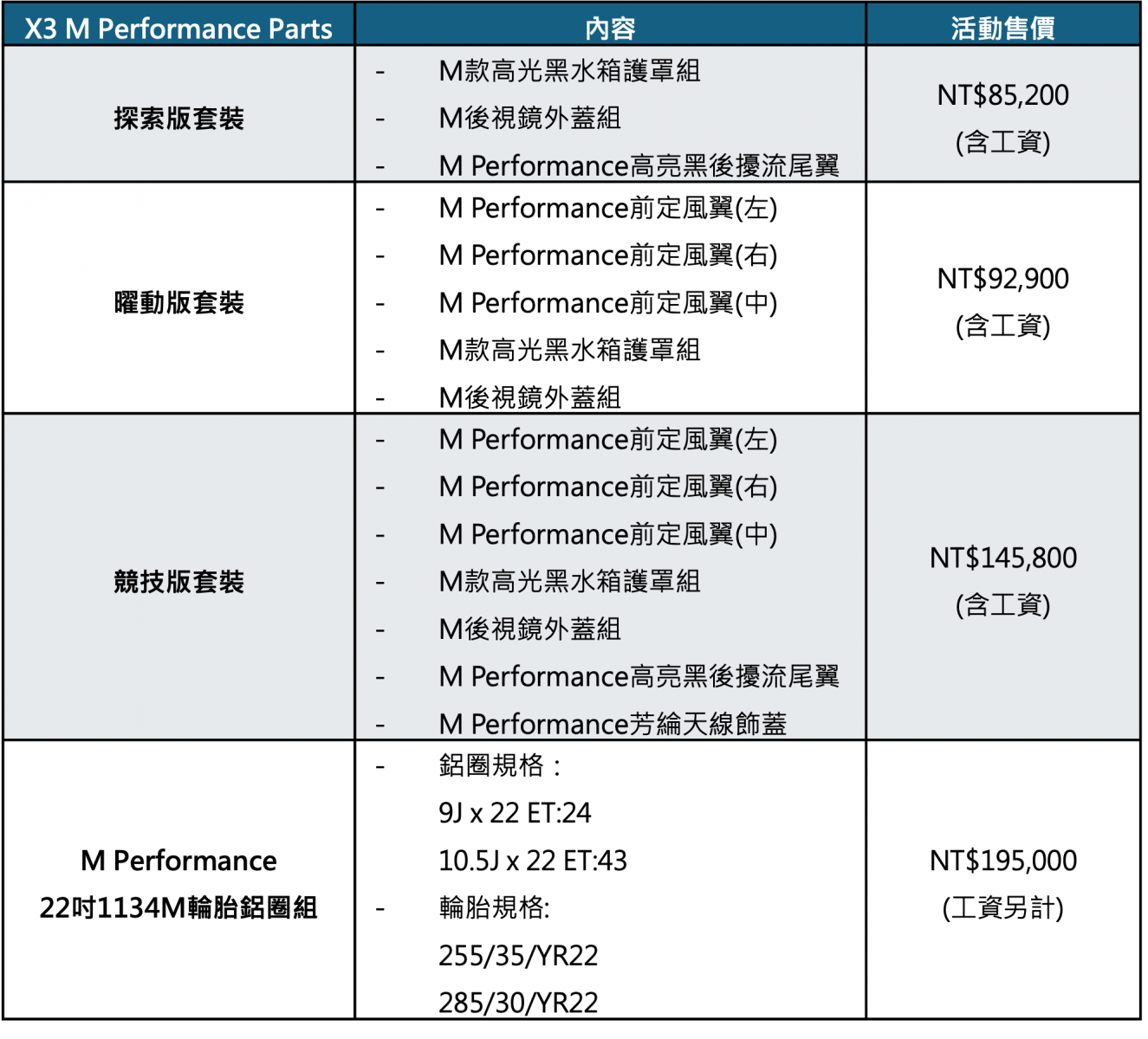 BMW X3 M Performance Parts原廠加裝品特仕套裝 內容與活動售價: