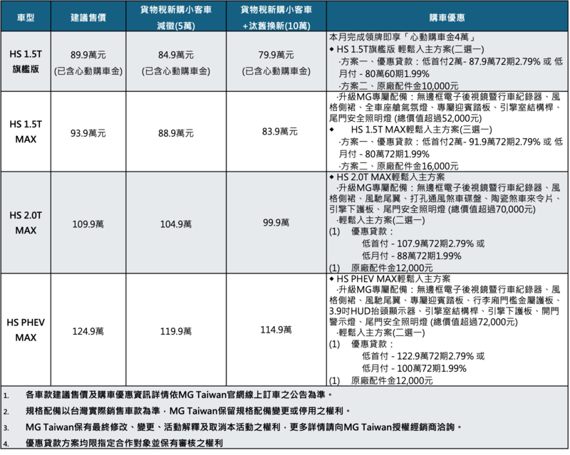 為回饋消費者的長期支持,MG Taiwan 於十月份推出購車優惠,全車系受惠於貨物稅新購減徵,HS 1.5T旗艦版搭配舊換新補助後最低僅需79.9萬元即可入主,成為國產中型休旅市場中最具安全與價值兼備的購車首選。