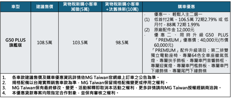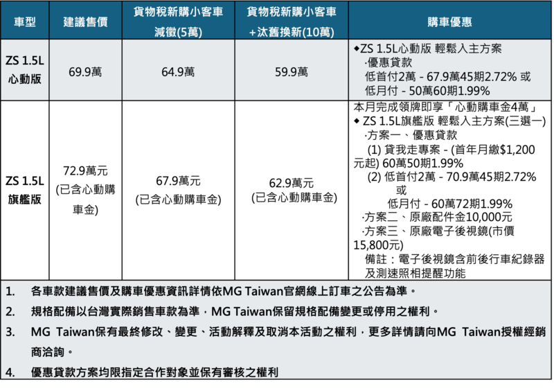 MG Taiwan 在十月份同步祭出全車系購車優惠,讓更多消費者能以無負擔的預算入主理想車款。全車系皆符合新購小客車貨物稅減徵,當家旗艦休旅HS搭配舊換新補助後最低79.9萬起;都會暢銷小休旅ZS 1.5L心動版,舊換新補助後最低59.9萬元即可入手;而甫於上個月上市的最親民正七人座駕G50 PLUS,舊換新補助後最低只需98.5萬元即可輕鬆入主。三大車系同步推出十月限定購車優惠,再加碼原廠電子後視鏡、配件金或彈性貸款等多重好禮,充分展現MG Taiwan對消費者的誠意與加碼回饋。