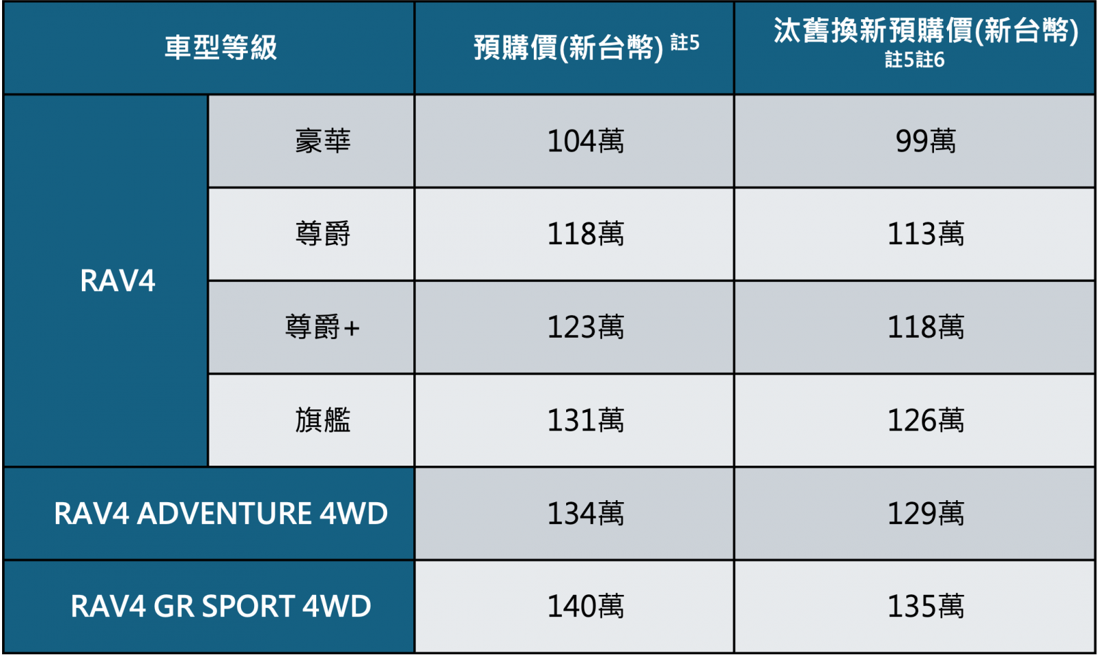 正式上市前,大改款RAV4將以汰舊換新預購價新台幣99萬元起註5註6 (多退少不補)。喜愛RAV4的消費者,可直接洽詢全台TOYOTA經銷商據點,相關資訊亦可上TOYOTA 網站查詢: