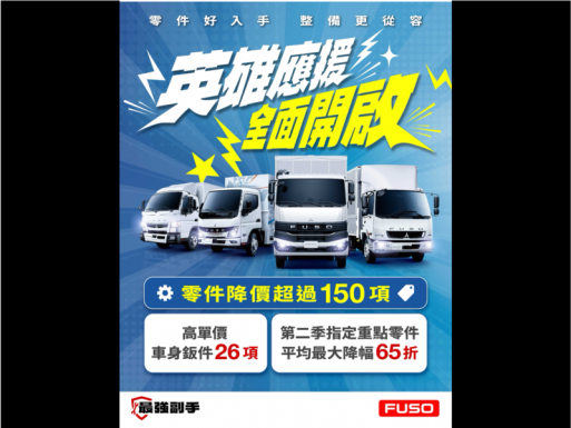 FUSO Taiwan持續以實際行動為頭家助力,同步推出【FUSO英雄回歸禮】及【零件好入手,裝備更從容】零件降價活動,提供車主好康優惠,並結合完善的售後服務支援,協助車主從容應對各項運輸挑戰,讓每一段行駛里程更加安心,替頭家省更多、跑更遠。活動詳情請洽全台 FUSO 授權經銷商裕益汽車各據點。