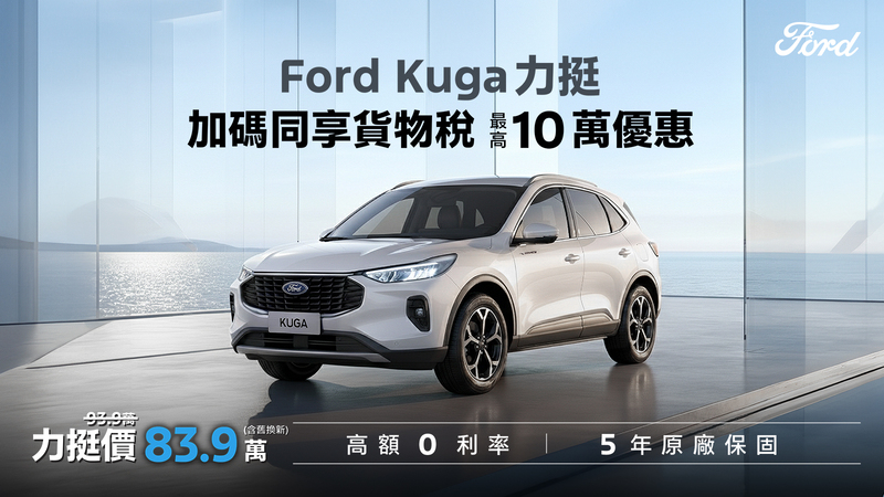 註二:The All-New Ford Kuga 1.5T享力挺價83.9萬,係指The All-New Ford Kuga 1.5T Vignale建議售價93.9萬享5萬元力挺購車金,再扣除政府補助舊換新5萬元,詳細資訊請洽Ford經銷商。
