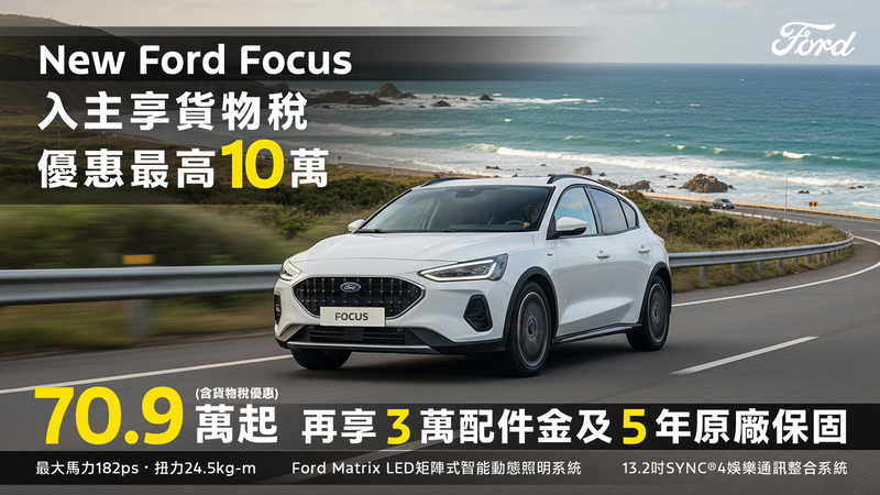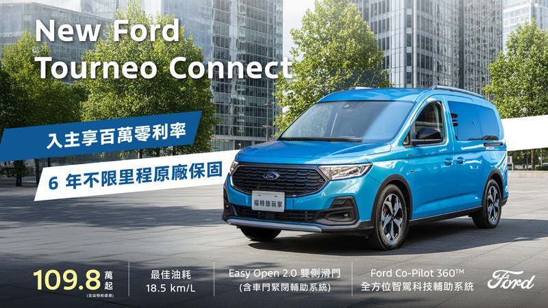 歐洲超能智駕跑旅The All-New Ford Kuga採用1.5T EcoBoost®渦輪增壓汽油引擎,經專屬調校可輸出187ps的強勁動力,動力與操控完美融合,帶來前所未有的駕馭快感,入主即享力挺價83.9萬(含舊換新),再加碼高額分期0利率及5年原廠保固;New Ford Ranger Wildtrak FRS Edition搭載Advanced 4WD智慧四輪驅動系統,可精準判斷全地形路況,智慧調節動力輸出,輕鬆征服各種險峻地形,入主享159.8萬(含舊換新)、百萬0利率及5年原廠保固;New Ford Focus提供多款車型選擇,搭配德規精準底盤調校,帶來靈活操控感受,入主享貨物稅優惠價70.9萬起,再加碼3萬元配件金及5年原廠保固;歐洲進口正七人座New Ford Tourneo Connect福特旅玩家,享貨物稅優惠價109.8萬起,加碼提供百萬0利率及6年不限里程原廠保固〔註四〕;歐洲首選國際商旅The All-New Ford Tourneo Custom福特旅行家,享貨物稅優惠價141.8萬元起,入主再享高額0利率。全方位陣容一次到位,無論是熱血自駕或商務出行,皆能滿足您的多元移動渴望。