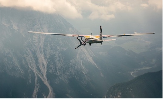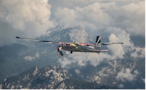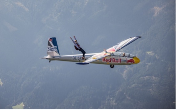 Domen Škofic從駕駛艙後座躍出後在左側機翼開始攀登,環繞並穿梭於滑翔機的兩側機翼下方。