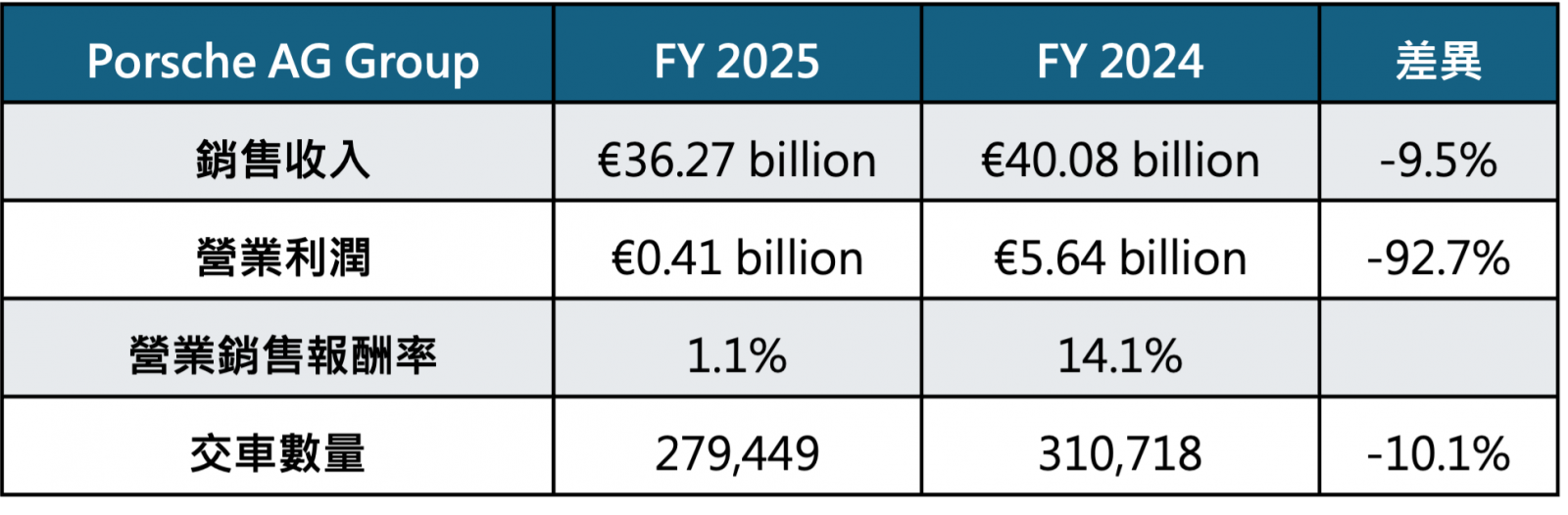 保時捷2025 財政年度充滿嚴峻考驗。集團營業額調整至 362.7 億歐元(2024 年:400.8 億歐元),集團營業利潤則由 56.4 億歐元降至 4.13 億歐元。此營運表現主要歸因於約 39 億歐元的特殊支出,其中涵蓋產品策略重組與企業規模調整(約 24億歐元)、電池相關業務的額外開銷(約 7億歐元),以及美國關稅的直接影響(約 7億歐元)。