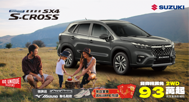 3. *「SUZUKI ALLGRIPxMIZUNO 跨界聯名專案」:本活動之適用對象為於2026/02/01~2026/02/26期間內購買S-CROSS 4WD、VITARA 4WD且完成領牌者,可獲得MXR乙雙(下稱贈品),原價新台幣3680元。數量及鞋子尺寸有限,送完為止。贈品以實物為準,恕不接受更換、退費或折抵現金。兌換憑證逾期、遺失或毀損,恕不補發。任何贈品使用之相關疑問,請逕洽台灣美津濃股份有限公司客服專線:02 2509-5100詢問, TAIWAN SUZUKI或原購車經銷商不負任何贈品擔保責任。 本活動不適用租賃、政府機關、專案批/標購者及營業車。兌換時間:2026年01月25日~2026年03月25日止。