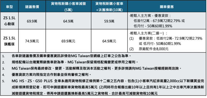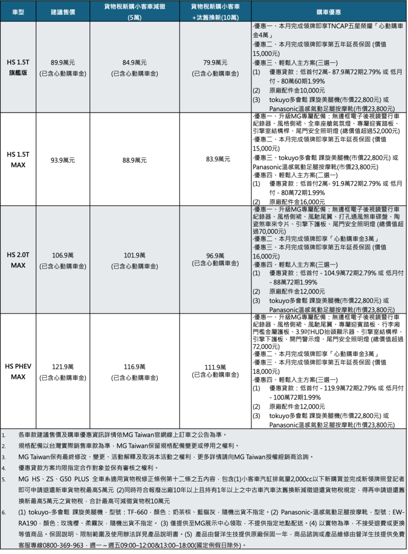 MG Taiwan在1月同步推出專屬購車優惠,全車系受惠於貨物稅新購減徵,HS車系搭配舊換新補助後最低79.9萬元起、ZS車系59.9萬元起、G50 PLUS 98.5萬元起,HS車型更提供五星榮耀心動購車金最高4萬元,本月完成領牌還可享有第五年延長保固(價值15,000元),為新年換車兼具安全與價值的最佳首選。