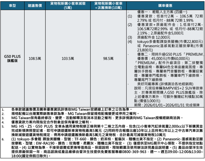 1月限時優惠期間,MG同步祭出旗下熱銷車款誠意價格回饋,HS車系搭配舊換新補助後79.9萬元起、ZS 59.9萬元起、G50 PLUS 98.5萬元起;凡於本月入主指定車款,除可享有多項靈活購車貸款方案與配件金外,亦可獲得tokuyo多會鬆踝旋美腿機或Panasonic溫感氣動足腿按摩靴二選一好禮,為購車體驗再添生活質感。
