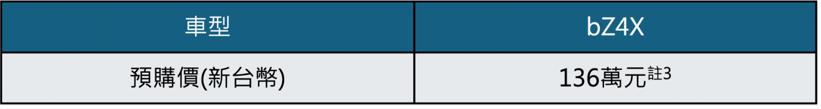 正式上市前全新進化純電休旅bZ4X將以預購價新台幣136萬元註3接受顧客預先下訂(多退少不補)。喜愛bZ4X的消費者,可直接洽詢全台TOYOTA經銷商據點,詢問預購相關事宜。相關資訊亦可上TOYOTA 網站查詢: