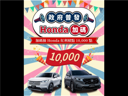 ◆ 活動內容:凡符合上述條件者,即可參加「政府普發,Honda加碼」紅利抽獎活動,將有機會獲得 Honda紅利積點10,000點。