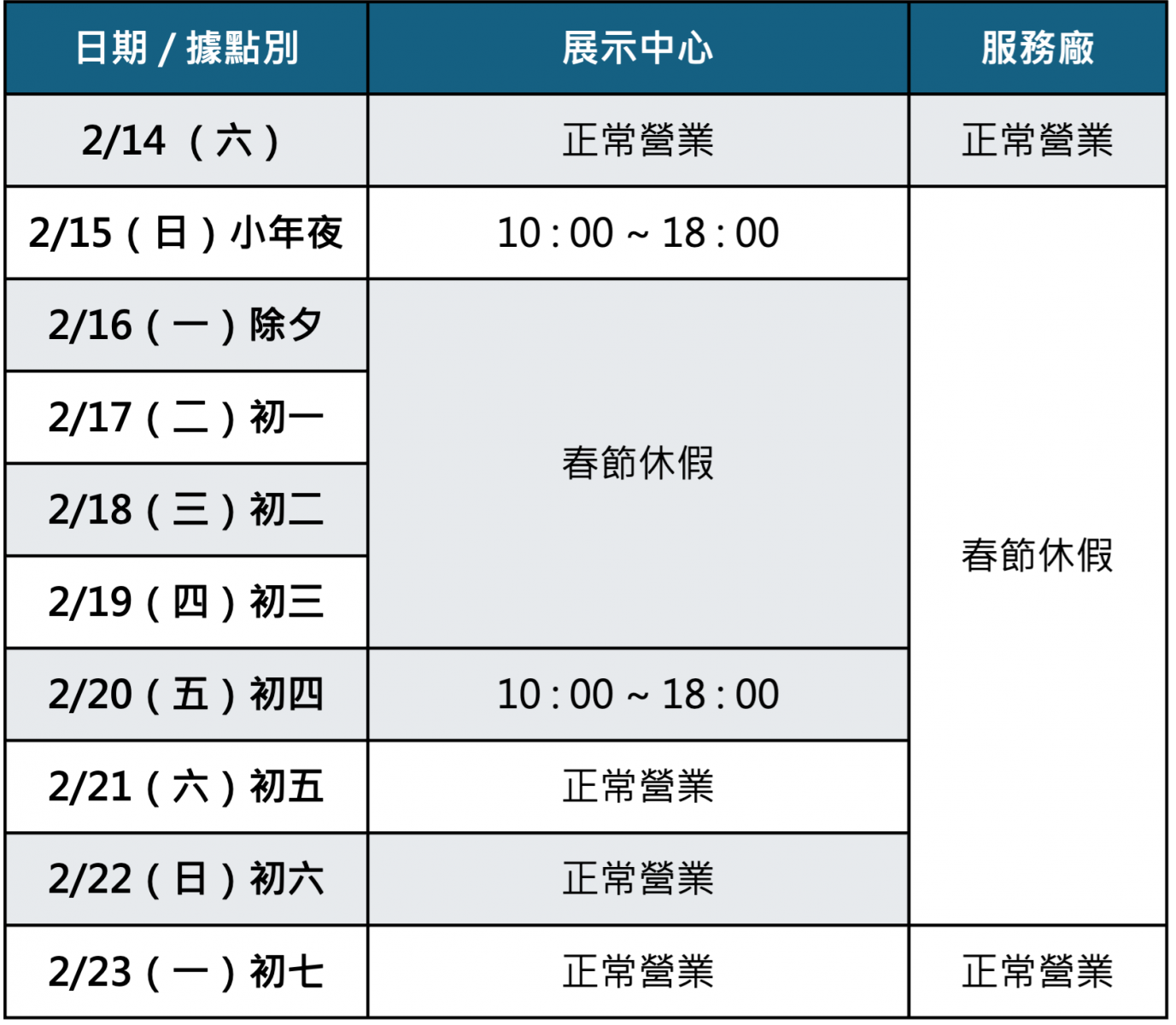 Kia全台乘用車及商用車展示中心自2月16日(除夕)至2月19日(大年初三)暫停服務;2月15日(小年夜)與2月20日(大年初四)營業時間調整為10:00至18:00,2月21日(大年初五)起恢復正常服務;服務廠則於2月15日至2月22日(大年初六)暫停服務,2月23日(大年初七)起恢復正常服務。詳情請洽客服專線0800-868-995或Kia官網