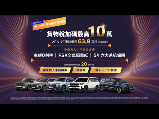HYUNDAI汽車九月限時購車案自1日起於全台展示中心實施,受2,000 c.c.以下新購小客車貨物稅加碼註1帶動,展間買氣回升,來店賞車人次較上月成長10%。HYUNDAI VENUE、MUFASA、CUSTIN、SANTA FE均屬政策適用範圍;若同時辦理符合要件之汰舊換新,合計最高可減負10萬元。全車系同步加碼「三好禮」:高額零利率、FSK全車藍鑽隔熱紙、5年六大系統不限里程延長保固,讓消費者把握九月黃金入主檔期。