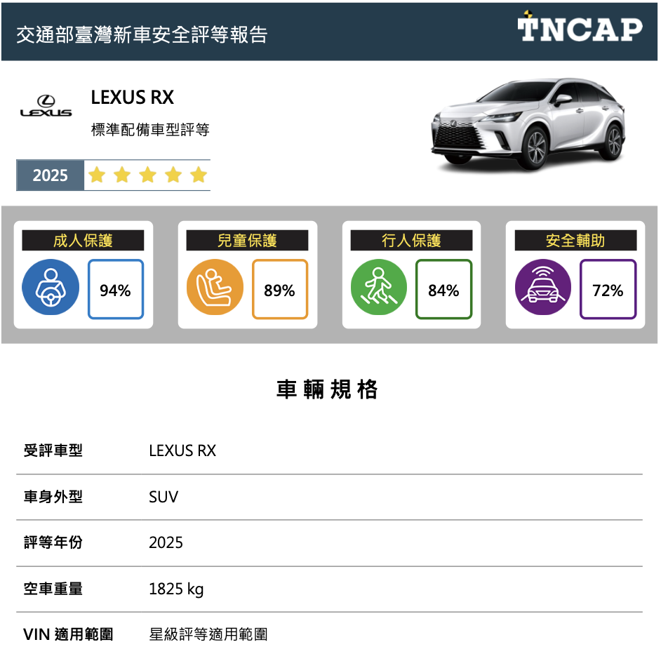 為提供消費者新車安全資訊,促使車輛產業升級,提升國內車輛安全性,國內推動臺灣新車安全評等計畫(TNCAP),在完成 114 年第三季三車型挑選、購置、試驗及評等相關作業後,今(30)日正式公布 TNCAP 第三、第四及第五順位受評車型的評等結果,LEXUS RX獲得五顆星評等,TOYOTA TOWN ACE 獲得零顆星評等,MG HS 獲得五顆星評等。