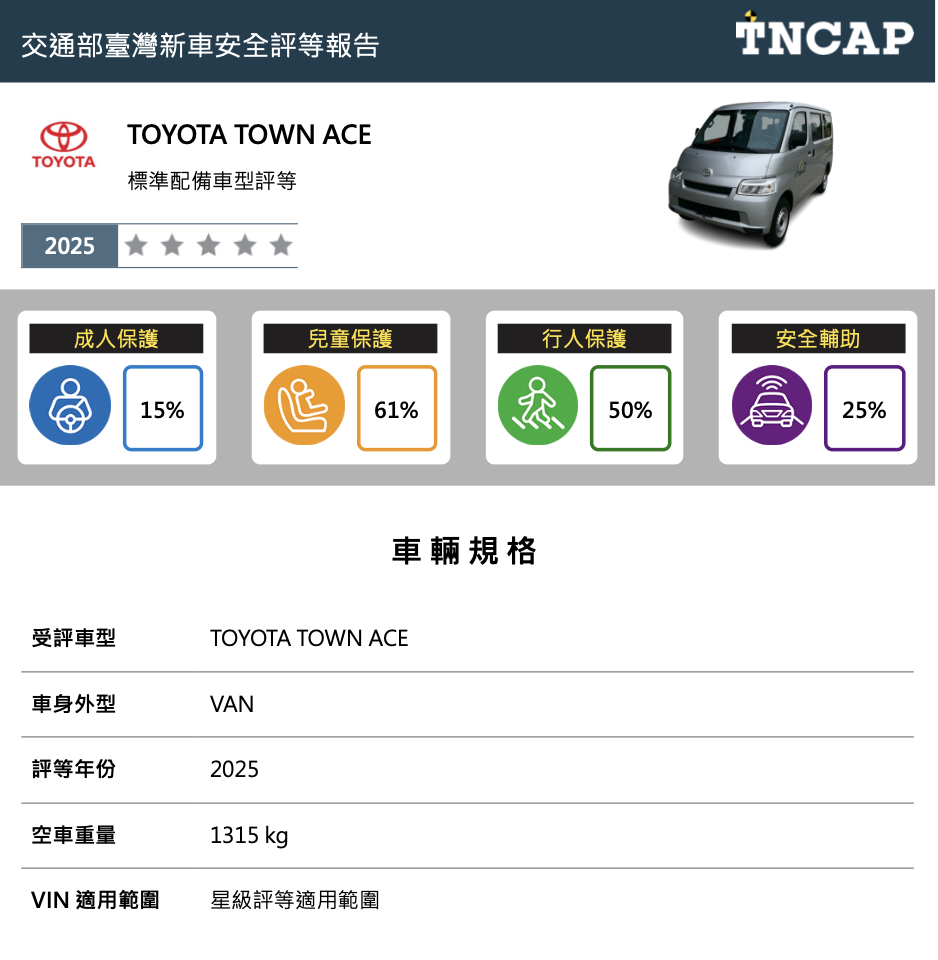二、 TOYOTA TOWN ACE 於四大安全領域得分率中分別獲得成人保護 15% 、兒童保護 61% 、行人保護 50%及安全輔助 25%,依據星級評等平衡標準規定,TOWN ACE 車型整體星級評等為零顆星。