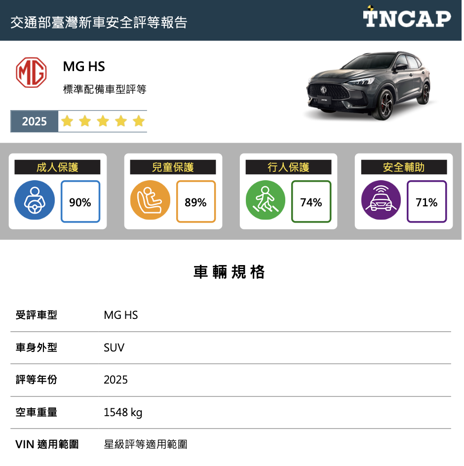 三、 MG HS 於四大安全領域得分率中分別獲得成人保護 90% 、兒童保護 89%、行人保護 74%及安全輔助 71%,依據星級評等平衡標準規定,HS 車型整體星級評等為五顆星。