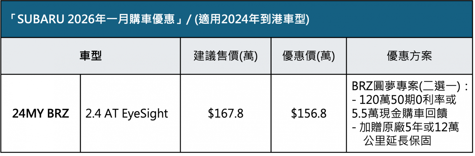 3. 上述優惠方案適用於2026年1月1日起訂車,且於1月31日前完成領牌手續。