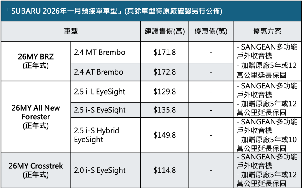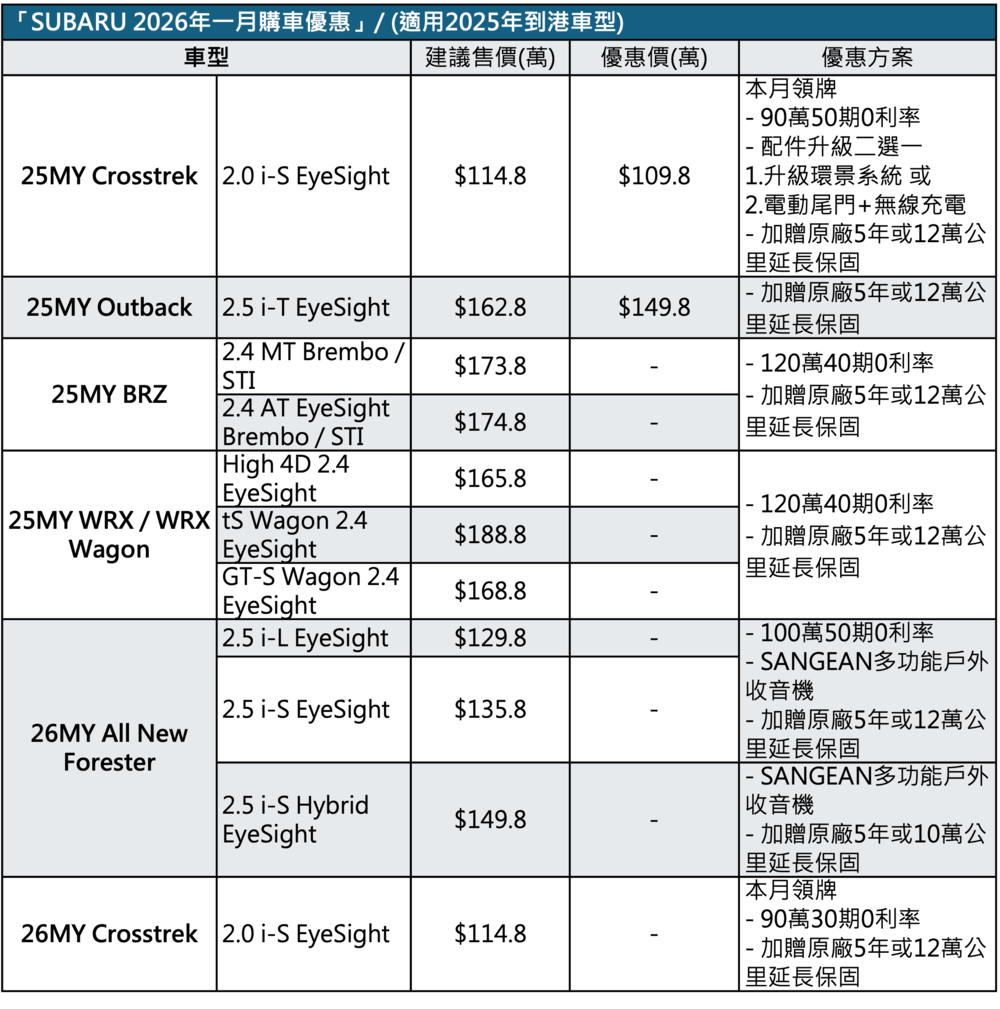 4. 各車款建議售價及優惠價格資訊詳情依展示中心與經銷商現場公告為準,台灣速霸陸保留最終更動之權利。