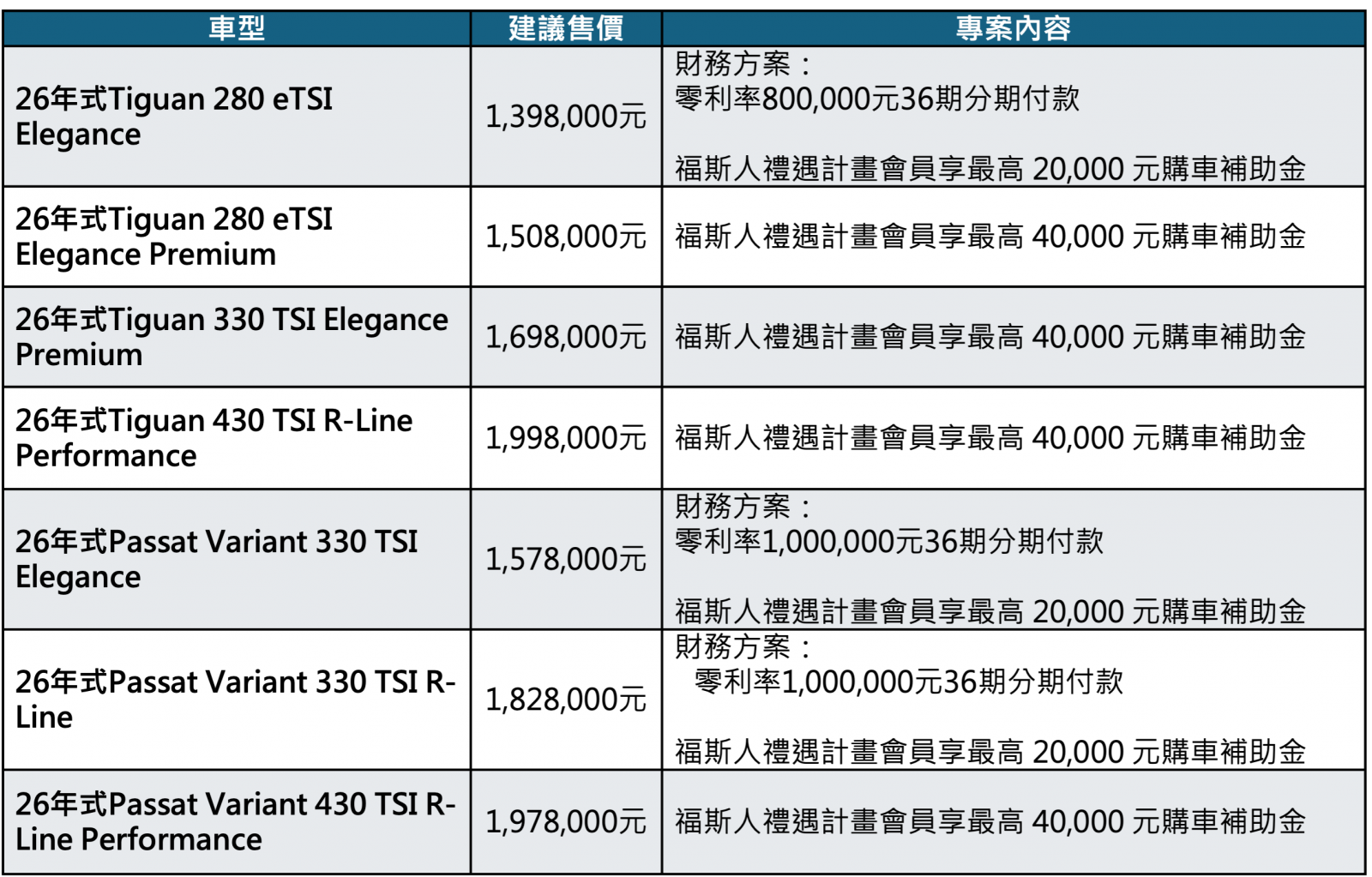 2026年1月優惠一覽(優惠適用對象與詳情請洽台灣福斯汽車授權經銷商):
