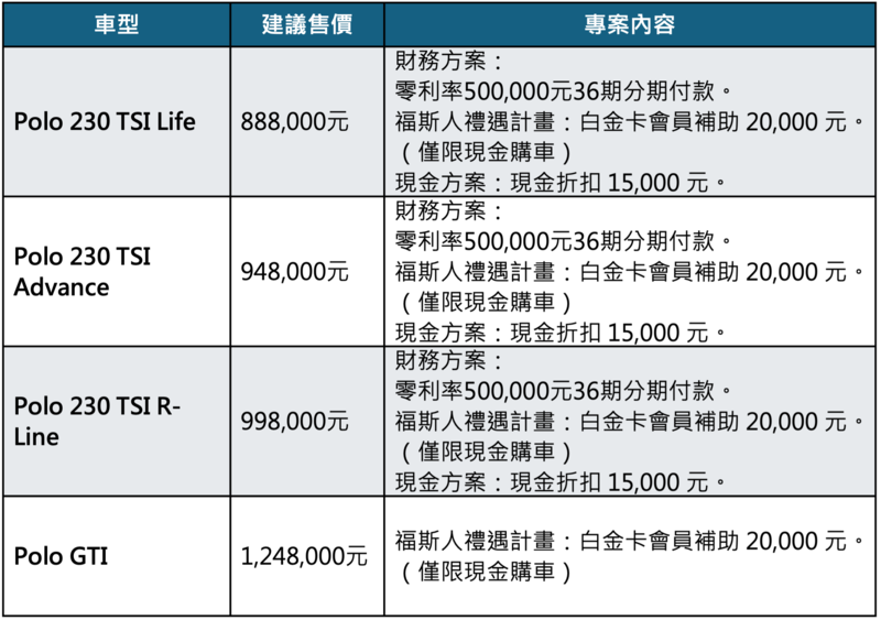 The Polo 購車優惠一覽(優惠適用對象與詳情請洽台灣福斯汽車授權經銷商):